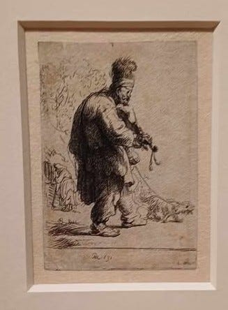 The exhibition highlights several particular approaches to the works on display: his experimentation with both the medium and the form of the work; his use of light and dark; and his remarkable abilities as a storyteller. All of these are very striking when looking at his work, and the exhibition is themed to emphasise these – From Life, Light and Dark, Shaping a Character, Landscapes, Techniques, Stories. The last of these is perhaps the one I focused on most, because in these tiny etchings which are filled with life and movement it feels as though one is looking at the scenes as Rembrandt saw them – he seems to offer direct representations with a great sense of immediacy, from his self-portraits to his street scenes. There seems to be no filtering (of course there was filtering, but to feel there isn’t is a source of power in the works) as he represents poor people about their business, such as the ‘Blind Fiddler’ with his dog (1631), above, or the wonderful interiors.