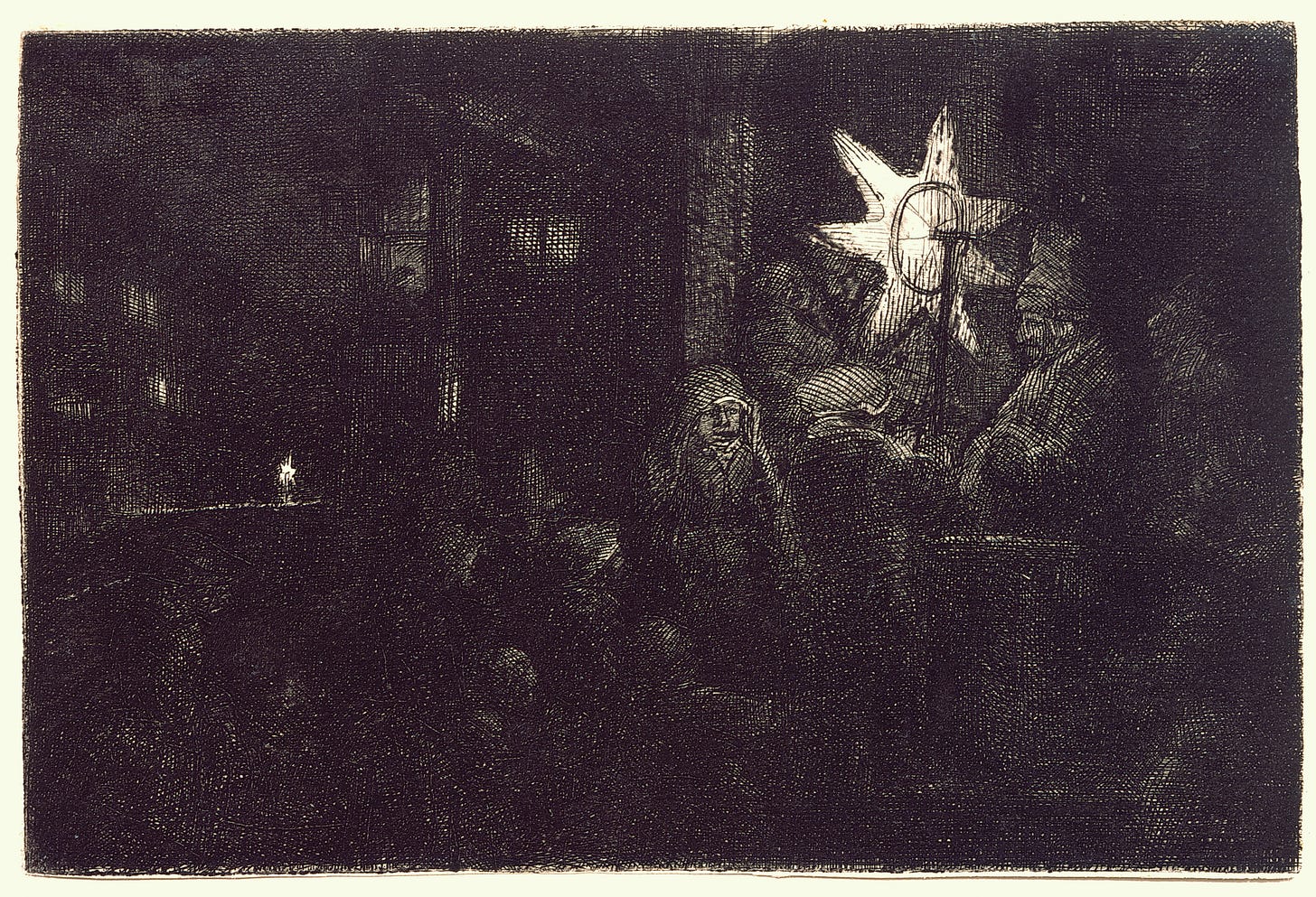 It really struck me the enormous attention to detail: in ‘Woman Sitting Half-Dressed by a Stove’ (1658), above, there is as much observation and detail in the chamberpot and the stove as there is in the figure and the shadows which fall around her. The images really repay close looking: from a distance, the image is perfectly clear, yet move closer and we begin to see the strokes which form the people, the places, the shadows – and then look closer still, with the magnifier, and other things appear – tiny people on the horizon, or faces peering from the darkness. I especially love the night scenes, such as ‘The Star of the Kings’ (1651), below, where the effects of light and dark both obscure and illuminate the figures, causing the viewer to peer as if in the dark themselves.